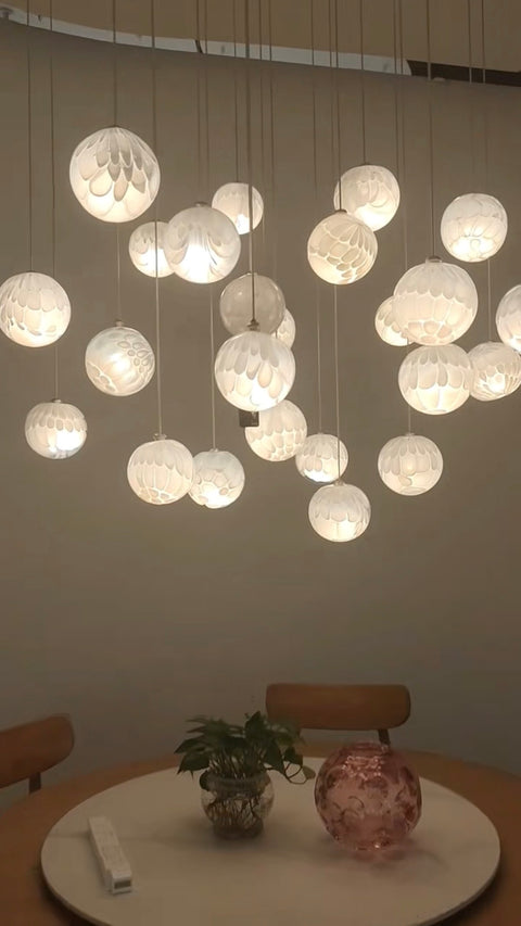 The Petalora Chandelier is a sculptural lighting masterpiece inspired by the soft layering of blooming flower petals. Each hand-crafted glass globe features a delicate petal-like texture that gently diffuses light, producing a warm and inviting glow. Suspended at varying heights, the illuminated spheres resemble floating blossoms, forming a graceful cascade that brings elegance and visual depth to any interior.